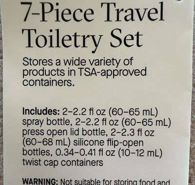 A: 2.2 fl oz spray bottle 2.2 fl oz press open lid bottle 2) 2.3 fl oz silicone bottle 2) .34 fl oz twist cap containers