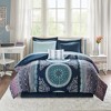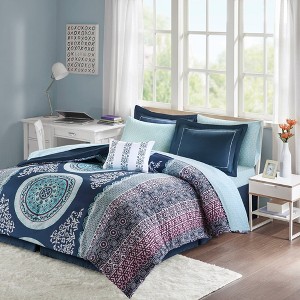 The Blaire Boho Comforter Set with Bed Sheets brings a bright, casual update to your bedroom. A large medallion print runs down the center of the comforter with subtle bohemian details highlighted. Coordinating shams (1 in Twin/TwinXL) with embroidered borders complement the comforter. A decorative pillow with ruched and pieced detailing and a solid navy bed skirt finishes the look. Also included is a complete sheet set that reiterates the bohemian motif. This bedding set is also OEKO-TEX certified, meaning it does not contain any harmful substances or chemicals to ensure quality comfort and wellness.