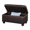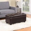 The Designs4Comfort 7th Avenue Storage Ottoman Bench by Breighton Home brings together timeless style and everyday functionality to elevate any room. Designed with versatility in mind, this spacious ottoman serves as extra seating, a comfortable footrest, and a stylish storage solution all in one. Whether placed in the entryway, living room, or bedroom, its elegant design fits effortlessly into both traditional and contemporary spaces. The button-tufted top, detailed stitching, and classic antique nail head trim add a refined touch, while the generous storage compartment neatly conceals blankets, pillows, and other essentials. A built-in pressure hinge keeps the lid open for safe, hands-free access to stored items. Upholstered in rich vegan leather and filled with plush foam for enhanced comfort, this piece is as cozy as it is chic. Built on a durable manufactured wood frame and supported by beautifully turned solid wood feet, this bench is as sturdy as it is stylish. Assembly is quick and easy, just attach the legs. With a wide range of sophisticated fabrics and finishes to choose from, the 7th Avenue Ottoman Bench is the perfect finishing touch for any living area.