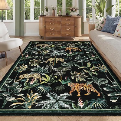 8*10FT Pastoral Meadow Low Pile Indoor Rug – Soft, Easy-Clean & Stain-Resistant Thin Carpet for Living Room, Bedroom & Kitchen-Black