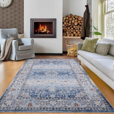 8*10FT Vintage Floral Non-Slip Rug Washable Short Pile Soft Carpet for Living Room Bedroom-Blue