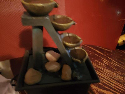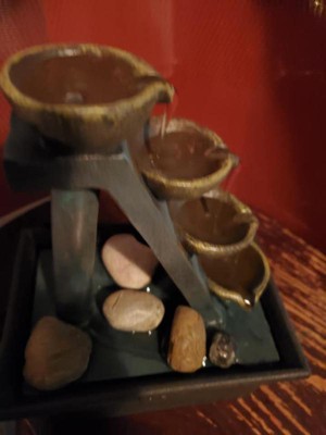 [This review was collected as part of a promotion.] I got this beautiful Alpine Corporation 8” tall indoor/outdoor 4-tier step tabletop fountain with rustic bowl and I love it goes well with my decor it’s not noisy the water look so relaxing as it falls down the rocks the cord is just the right length that I don’t have to use an extension cord the fountain it self isn’t to big it fit just right on any table