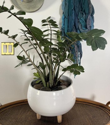 - A simple and elegant ceramic planter with a round shape and three wood feet that will add some style and sophistication to the home