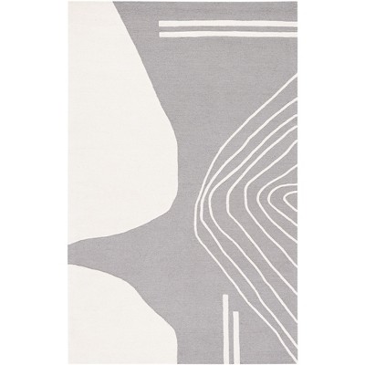 A: The rug features an abstract motif inspired by natural rock formations, providing a unique aesthetic.
