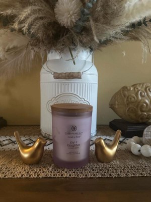 Experience a fragrance-filled journey into wellness with the Joy and Laughter Fragrance in the Mind & Body Collection from Chesapeake Bay Candle®. From the first lighting, you'll be inspired — the mood-enhancing fragrance infused with pure essential oils and the softly colored frosted glass create a peaceful, spa-like feel. The wood grain lid adds a comforting element of nature, making this candle a beautiful gift for yourself or others.