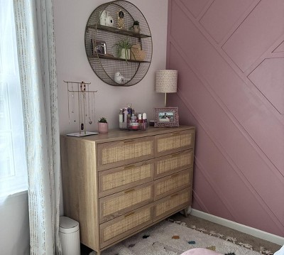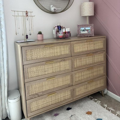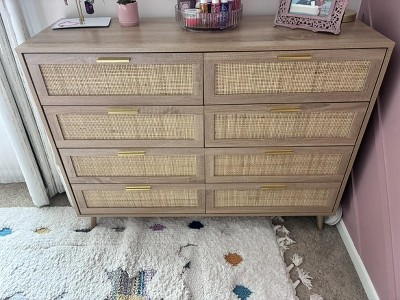 【Organized Versatile Storage Solution】 This 8-Drawer Rattan Dresser is a versatile storage cabinet for living rooms, children's rooms, entryways, nurseries, and more! Each drawer measures 22.8" x 7.3", maximizing storage, and the 8 deep drawers provide ample space for clothes, toys, and office supplies, while the sturdy top desktop can bear up to 44 pounds, easily accommodating daily necessities such as keys, alarm clocks, or small decorations.