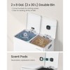 Upgrade your kitchen with this premium dual-compartment trash can, featuring two 8-gallon stainless steel bins with modern chamfered lids for a sleek aesthetic. The commercial-grade construction ensures durability while integrated scent pods neutralize odors for lasting freshness. Enjoy hands-free operation via sturdy pedals, with soft-close technology for quiet use and 90° stay-open functionality for extended tasks. Includes two removable inner buckets with secure bag holders and 15 custom-fit trash bags (compatible with Code H). The finish blends seamlessly with contemporary kitchens, combining smart waste management with elevated design. Material: Stainless Steel, PP Plastic Product Size: 23"L x 14.6"W x 25.2"H (58.5 x 37 x 64 cm) Height with Lid Open: 37.7" (95.8 cm) Product Weight: 20.5 lb (9.3 kg)