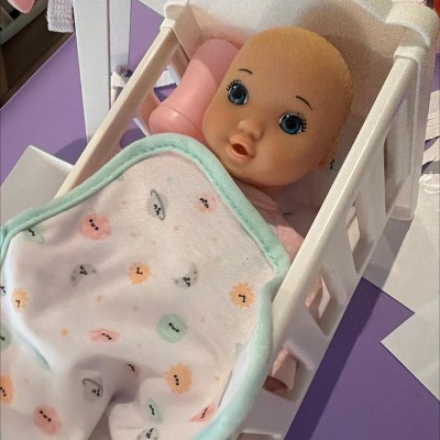 Your little one's playtime will be creative and fun with this 8in Little Baby Doll Set from Gigglescape™. The baby doll is wearing printed pajamas and has blonde hair and blue eyes for a cute look. The set includes pajamas, high chair, crib, plate with food, bottle, crib mat, pillow, blanket, and bunny toy. This doll set makes a great addition to your tiny tot's toy collection or a fun gift option.