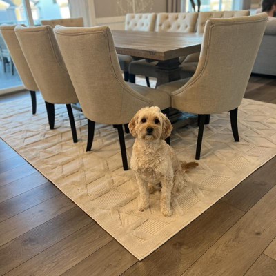 This rug is beautiful. We wanted something under our dining table, it needed to be neutral and washable. Many reviews mentioned the wrinkles and doesn’t lay flat, but ours flattened out nicely within a console of hours! Our roomba zooms over it easily and the whole family is enjoying it!