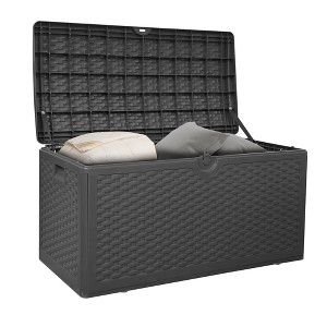 Transform your outdoor space with this versatile storage box that's perfect for organizing patio essentials, garden tools, sports equipment, pool supplies, and more. The sleek gray design features a vertical plank pattern that adds modern style to any outdoor setting. Built for durability and functionality. The compact footprint of 43.3"x22.4" makes it ideal for patios, decks, or balconies where space is at a premium. Whether you need extra seating for guests or weatherproof storage for outdoor cushions and accessories, this multipurpose storage box delivers both form and function. Its neutral color scheme and clean lines complement any outdoor décor while helping keep your outdoor living space tidy and organized.