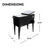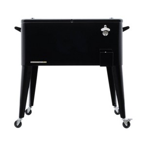 This stylish 80 Quart powder coated patio party cooler cart will add a classic touch to any backyard or patio. It holds up to 110 – 12oz cans with plenty of room for ice. The insulated basin keeps drinks cool for up to 36 hours. The versatile design includes four heavy-duty casters for easy mobility, two locking for stability once in the desired area. Keep guests happy outside your home and drinks cool. The cooler features an easy to use cap remover. The additional shelf below adds space for more drinks and snacks.