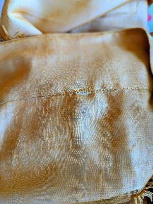 My curtain that I ordered in mustard yellow, came with a big black stain on it, that wasn't visible when it was folded up and packaged, meaning it was already stained/damaged when they packaged it. Also, the yellow material is like gauze and is not the bold golden shade that is pictured, but looks more like butter, again the white curtain underneath. It is also very poorly made. The yellow fabric is already ripping near the seams. I'm so disappointed in this item