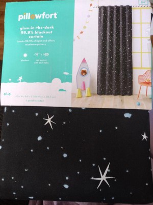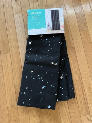 Create a space-themed look in your kid's space while preventing early-morning sunlight from entering with the Space Kids' Blackout Window Panel from Pillowfort™. Made from recycled polyester fabric, this black curtain panel is covered with star print for a beautiful look. Designed with rod pockets for quick installation, this blackout panel is also machine washable for easy maintenance.