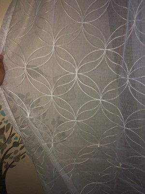 [This review was collected as part of a promotion.] A couple weeks ago, I bought a pair of these curtains. Let me just say they are great. They let in the perfect amount of light by being thin but not so much that if someone walks past they can see inside of your windows. The embroidery is great and makes for a wonderful design. I will be getting more of these.