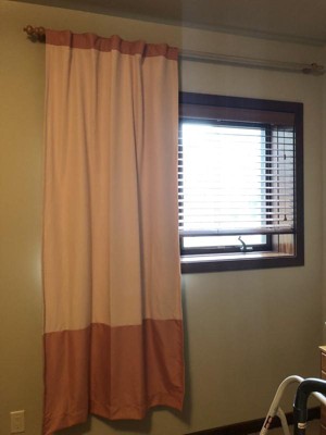 Panel has a nice silky feel and definitely blocks out light. The side light coming through is because I didn’t hang the panel far enough to left. Color is true and the tabs slide easily over wooden pole.