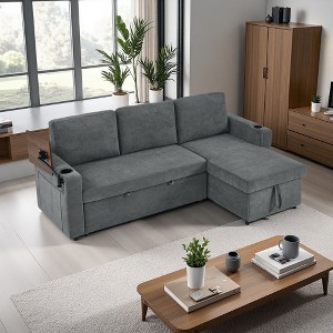 85" Modern L-Shaped Chenille Sectional Sofa Bed with Retractable Table, LED, USB & Cup Holders
