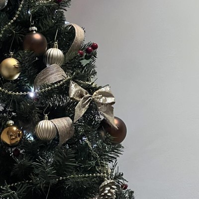 A: Hello Tricia - Thank you for reaching out! The 8-Count Glitter Christmas Bows is designed in a champagne gold hue with allover glitter. It can be hung on your tree or attached to wrapped gifts, and ideally used for indoors only. Hope this helps! - Eram