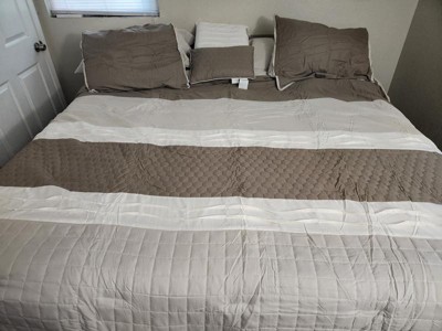 [This review was collected as part of a promotion.] I'm really happy with this comforter set for the hot californian summer. It was really light weight and slept very cool. The comforter is in beige and bone tones and super modern. The comforter has a zipper on the side where the shell can be removed to be machine washed. I'm really happy with this set and recommend it!