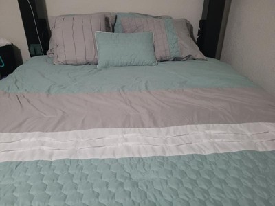 [This review was collected as part of a promotion.] This comforter set is a soft white, grey, and seafoam green. It is simple and modern design. I consider it unisex because it meets right in the middle of being feminine and masculine. My fiance and myself both agree on it. It fits in perfect with our ocean themed bedroom. I was hoping to be able to use the pillow cases, however they are more for decoration. The texture is not comfortable to lay my head on. It comes with 2 Euro shams, but not the pillows. Which is a bummer because I definitely dont have those size pillows. A bed skirt is included that I am unable to use because my bed frame is close to the floor. However, I appreciate that it came with the set. I like that it is easy to wash in my home washing machine.
