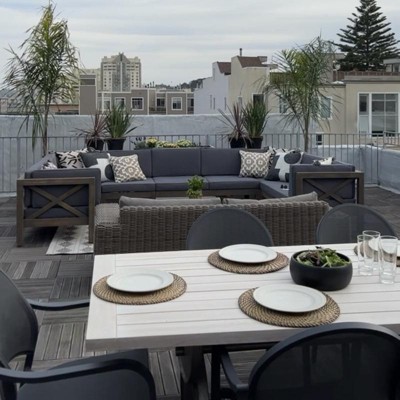 I used this on a rooftop I designed in San Francisco. It’s an amazing piece for a great price. It’s very weather proof as well, although it doesn’t feel the greatest texture wise, you can dress it up with pillows and some blankets and it does the trick and looks lovely. I just wish you could tie the cushions down so they don’t blow away. Otherwise it’s an amazing set, as well it lasts!