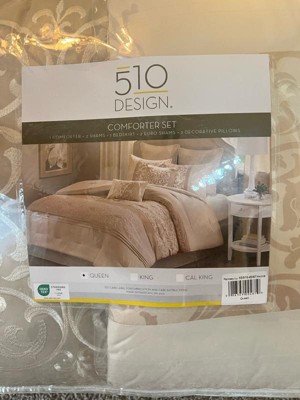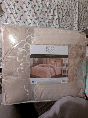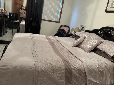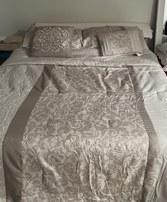 A: Traditional 8 piece comforter set in quilted, printed and pintucking details.Embroidered and pleating on the decorative pillows