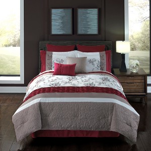 The Ellie 8 Piece Comforter Set from Riverbrook Home will transform your room with a stunning palette of romantic deep reds and soothing pale taupe. Embellished embroidered details, combined with multiple patterns and textures are featured throughout the paired decorative pillow shams, accent pillows and bedskirt to create the final touches to your dream room. Machine Washable; follow care instructions on each piece for best result.
