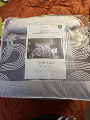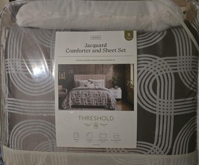 Add an eye-catching, textured look to your bedscape with the 8-Piece Jacquard Chain Link Comforter and Sheet Set from Threshold™. The 8-piece bedding set includes a comforter finished with a chain link pattern for a stylish look, along with a fitted sheet, pillowcases, shams and a faux-fur decorative pillow to give you loads of options for a cozy bedroom. A fitted sheet is also included, with all-around elastic to accommodate mattresses for comfortable use. This multi-piece comforter bedding set boasts a lightweight jacquard fabric construction and is machine washable for easy cleaning.