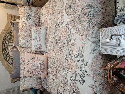 Q: Is the background color of the comforter white or more of a creamy beige?