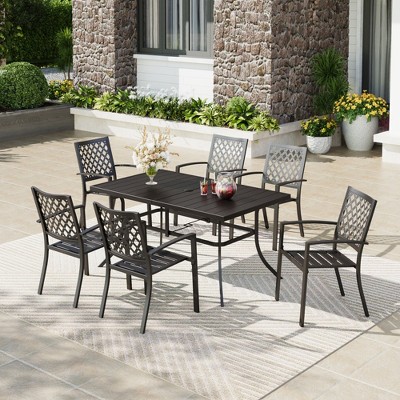 Captiva Designs 8pc Outdoor Patio Dining Horizaontal Steel Table & Padded Sling Armchairs & Blue Umbrella