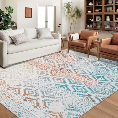 Modern Washable Area Rug, Geometric Pattern Bedroom Carpet with Non Slip Backing, Low Pile Stain Resistant Floor Carpet, Colorful