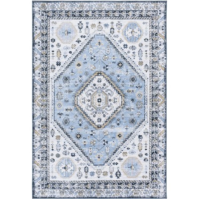 8x10 Washable Carpet, Vintage Distressed, Non-Slip, Non-Shedding Backing, Floor Cover, Soft, Short Pile, Foldable, Floral Badge Print Carpet, Blue
