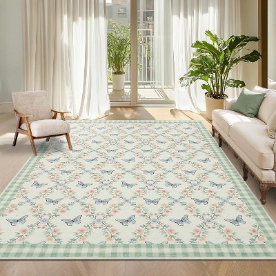 - Charming Floral & Butterfly Garden Design.Adorns a soft base color with delicate light blue butterflies, small flowers, and checkered borders. This pastoral, retro-style rug creates a warm and romantic atmosphere, seamlessly blending vintage charm with a modern aesthetic.