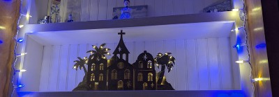 this is so cute with my wood nativity on a shelf! it lights up as well. it looks way nice at home than in the store. and I put candles by it and it reflects so nicely on the gold. it is made of cardboard its fragile.