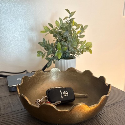 This gold cast metal bowl is a fantastic decorative piece. It is extremely versatile. I have used it as a plant holder, an accent piece on a console table, and a fruit bowl. It's sturdy and durable. Definitely a great buy!