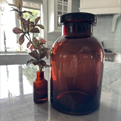 A: Hello Hot tub roof - Thank you for your question on 9" Rusty Quince Artificial Fall Arrangement. The arrangement is in an amber glass vase. I hope this helps. Have a great day - Pavan