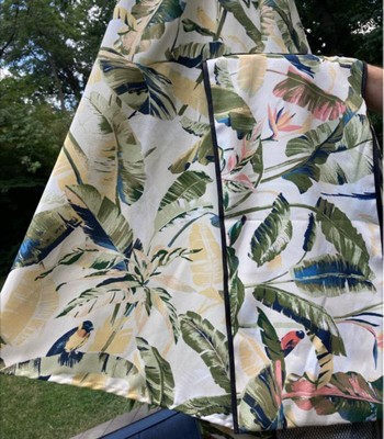 This outdoor umbrella has an attractive print. That was hard to find. It is a good size, nice material, and good price. Opening and closing the umbrella are easy. When closed, fabric ties make it even more secure. We are very happy with the purchase.