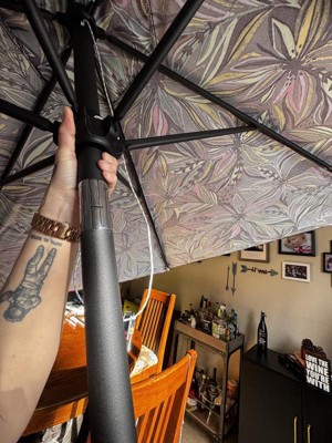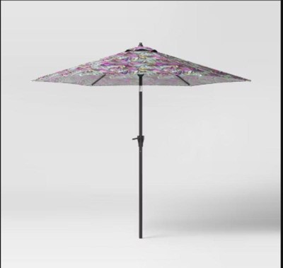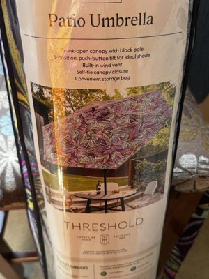 This 9-Foot x 9-Foot Market Patio Umbrella from Threshold™ makes a practical and attractive addition to your porch or patio. Made with fade-resistant fabric for lasting outdoor use, the umbrella has a black pole and steel frame and is compatible with centered pole umbrella bases (sold separately). It's easy to set up with no tools needed, and with a crank lift and push-button tilt, you can effortlessly adjust the umbrella to maintain the perfect shady spot.