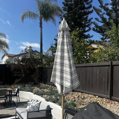 Put the finishing touch on your patio oasis with this 9-Foot x 9-Foot Market Patio Umbrella with Faux Wood Pole from Threshold™. Made from fade-resistant fabric it's designed for lasting outdoor use. The umbrella is compatible with centered pole bases (sold separately) and is easy to set up with no tools needed — and best of all, the crank lift and push-button tilt let you adjust the umbrella to keep everybody in the shade.
