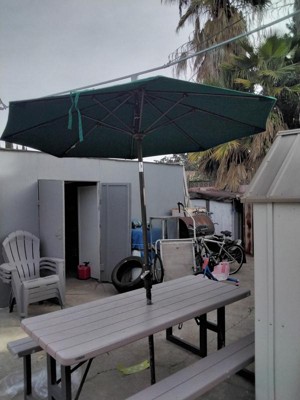 9ft x 9ft blue outdoor umbrella brings extra shade and style to patio seating