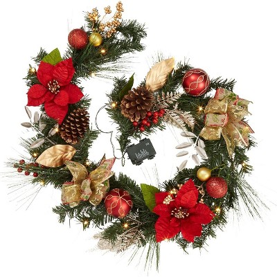 9 Feet Pre-Lit Christmas Garland with Lights,Battery Operated Lighted Outdoor Xmas Garland with Red Gold Ball