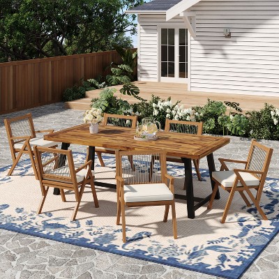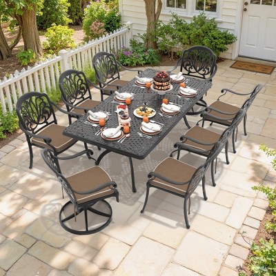 9-Piece Rectangle Cast Aluminum Outdoor Patio Dining Set with Swivel Chairs & Blue Cushions & Umbrella Hole