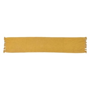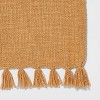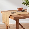 A: The table runner features a textured construction with tassel detailing for a rustic charm.
