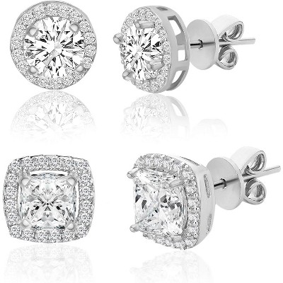 925 Sterling Silver Cushion Round Shaped Cubic Zirconia Halo Stud Earrings for Women 2 Pair Earring Set Sliver