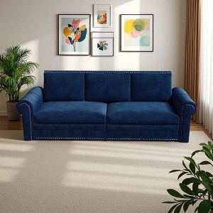 - Traditional Retro Style: The velvet sofa has a simple and exquisite design, with a luxurious appearance. The hand-inlaid rivet head trim is elegant and eye-catching, and the classic roll armrests provide comfortable support. The couches for living room blends traditional vintage with modern chic, making it the perfect addition to living rooms, apartments, offices and other seating areas.