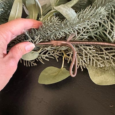 [This review was collected as part of a promotion.] This is a beautiful olive branch and pine branch faux garland. This measures about 96 inches in length. It is beautiful with the combination of the two textures of bridges and leaves. You could use this to decorate for Christmas or leave it up your round and it will still fit in with your decor. This also has some beautiful tan/bronze velvet textured bows on both ends.
