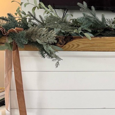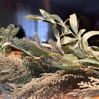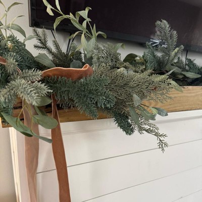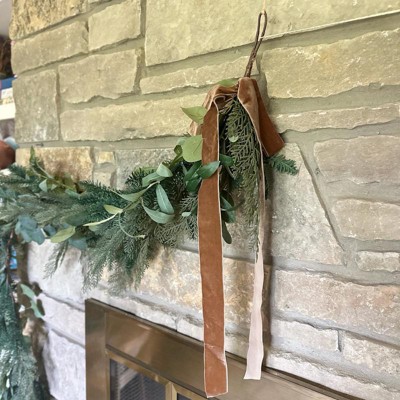 Bring the beauty of the winter season into your home with this 96-Inch Extra-Full Olive and Pine Holiday Garland from Threshold™ designed with Studio McGee. This green garland is densely covered with faux olive leaves and pine foliage and adorned with an elegant brown velvet-finish bow with trailing ties at the end, offering a refined seasonal accent for your space. The eight-foot length provides ample coverage for mantels, doorways, staircases, or table displays while also serving as the perfect foundation for layering with lights, ornaments, or ribbon to create personalized holiday arrangements.