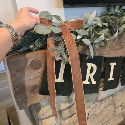 [This review was collected as part of a promotion.] should have measured this because i will need two to make the perfect christmas fireplace. i’ve been searching for the right way to accent my fireplace given we don’t have a mantel for the entire seven years we have lived here and i finally found it! drapes beautifully if you arrange the leaves a bit thought it’s fairly stiff so you need to find the right transition points to hang it. there is several built in hanging loops. the bows add the most gorgeous luxe touch.