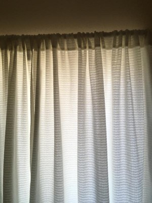 [This review was collected as part of a promotion.] So I finally found the time to hang these lovely curtains. I was looking for something simple and clean and these are great. The tiny waffle print gives it a nice texture and slight depth. The fabric quality feels of greater quality, while not being to thick and still given some sunlight. The fact that they are repellent against dust and hair is a big plus, having tile flooring seems to always make the bottom of my curtains so dirty.