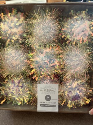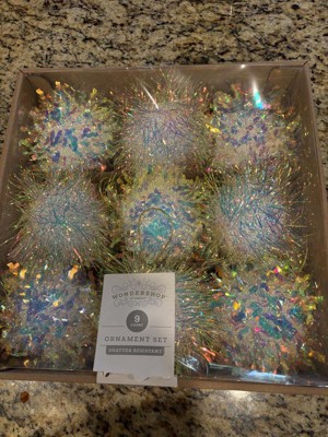 These are SUPER CUTE! There's 9 in the box; 5 have zigzag design and 4 have spikey design. Because of the iridescent coloring, they look different colors in different light which will be super cool with Christmas lights on a tree. Made of styrofoam center so they're also very lightweight.
