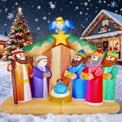 9FT Christmas Inflatable Decoration, Inflatable Nativity Scene with Starry Night Backdrop, Blow Up Yard Decorations for Holiday Party Yard Lawn Garden